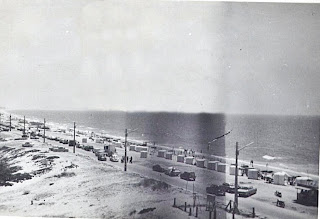 Julgo que esta foto foi tirada no dia 11 de Agosto de 1968. Dia de muito vento, em que não estava fácil estar na praia. Assim o grupo da minha mãe, decidiu abrigar-se de armas e bagagens (para um piquenique de praia) dentro de um edificio em construção, que viria posteriormente a ser o Hotel Dom José.